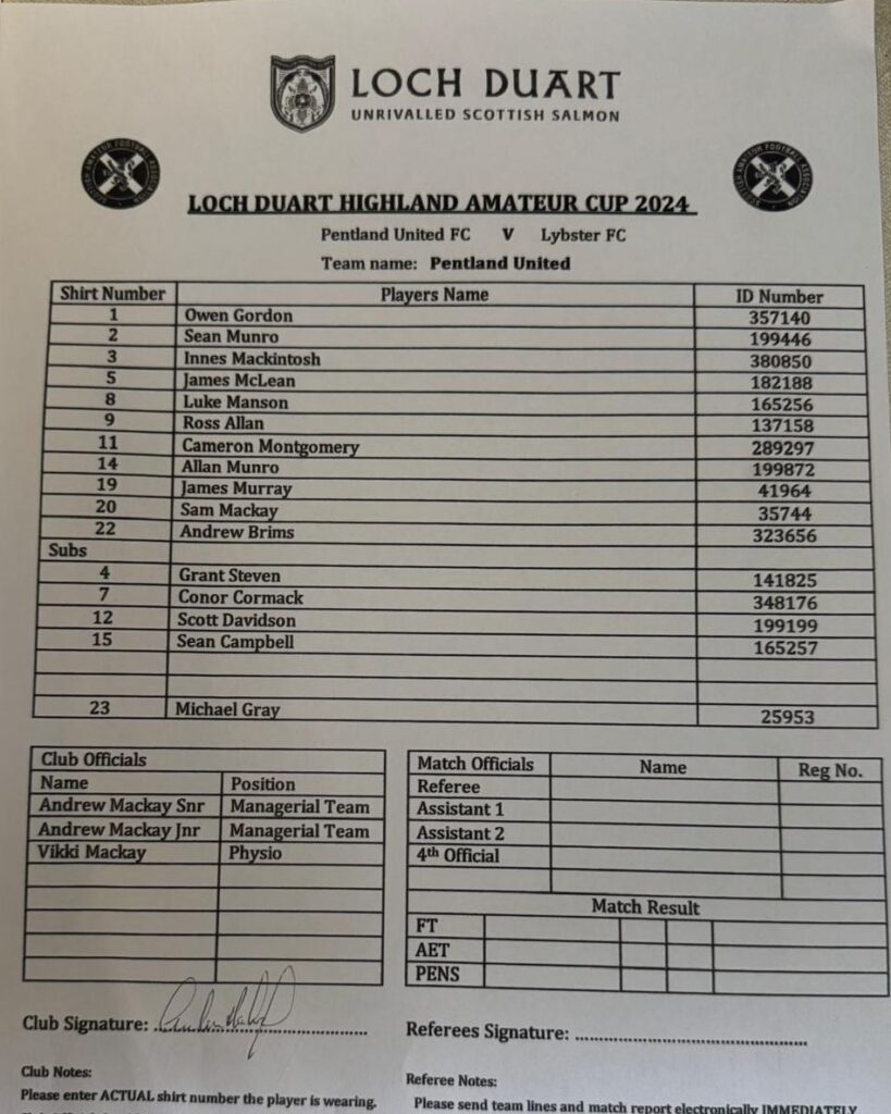 Latest score – Pentland United 6 v Lybster 0 – HA Cup Round 3. PU goals from Allan Munro, Cameron Montgomery, James Murray 2, Andy Brims and Sean Campbell.